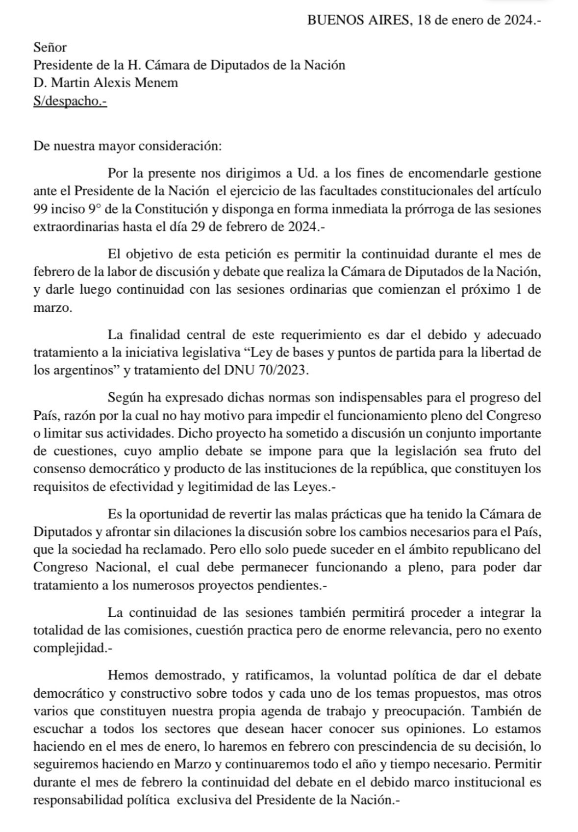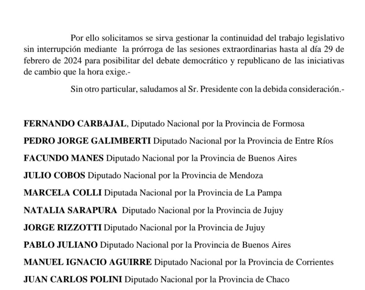 Facundo Manes, junto a otros diputados radicales, envió una nota al Presidente de la Cámara de Diputados de la Nación, Martín Menem, bajo el título «Ni a las apuradas ni a los empujones». En dicha nota se solicita la prórroga del período de sesiones extraordinarias. «Si de verdad consideran trascendente para el país el tratamiento de este proyecto, se necesita seriedad, que es lo contrario a la improvisación y a la prepotencia»-expresan.