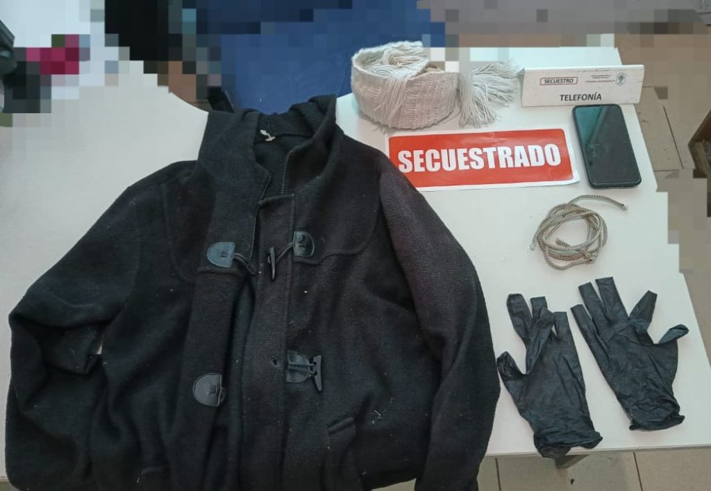 Asimismo se incautó un teléfono celular motorola modelo G8 color rojo, una soga de aproximadamente un metro y medio, un par de guantes de látex negro, una campera con capucha de color negra, y una bufanda de tela color blanca, aparentemente todos elementos que fueron utilizados durante el hecho delictivo en cuestión.