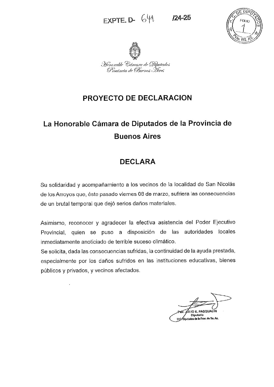 Pasqualin, oriundo de nuestra ciudad, presentó esta iniciativa en la Cámara Baja bonaerense, y allí plantea también su reconocimiento por la ayuda que brindó en todo momento el gobierno bonaerense.