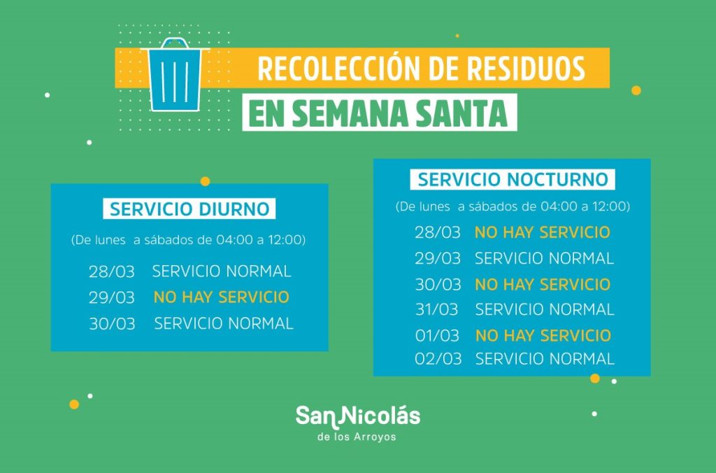 La Municipalidad de San Nicolás informa que habrá cambios en la recolección de residuos por el feriado de Semana Santa y el Día del Veterano y los Caídos en la guerra de Malvinas.
