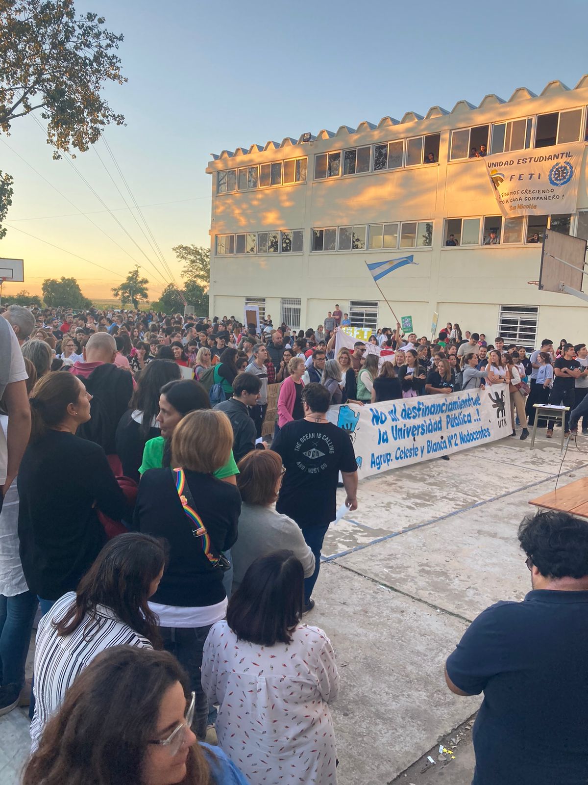 En el caso puntual de San Nicolás, la convocatoria se realizó a partir de las 17 hs en la Plaza Sarmiento. De a poco fue llegando mucha gente, y a eso de las 18 hs. se movilizaron todos hasta el Playan de entrada a la Facultad Regional San Nicolás, que depende de la Univerisdad Tecnológica Nacional.