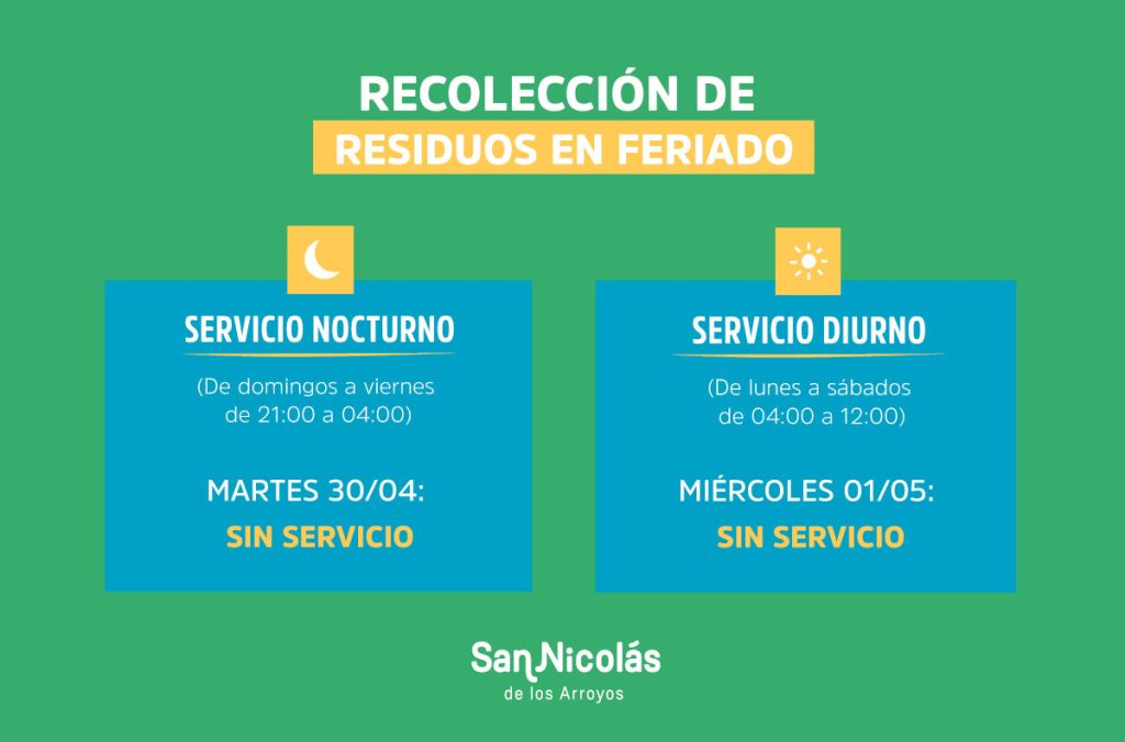 La Municipalidad de San Nicolás informa que, debido al feriado del miércoles 1 de mayo por el Día del Trabajador, habrá cambios en la frecuencia de la recolección de residuos sólidos urbanos. Se pide a los vecinos que, atendiendo los días y horarios del servicio, cuiden de la limpieza de la vía pública.