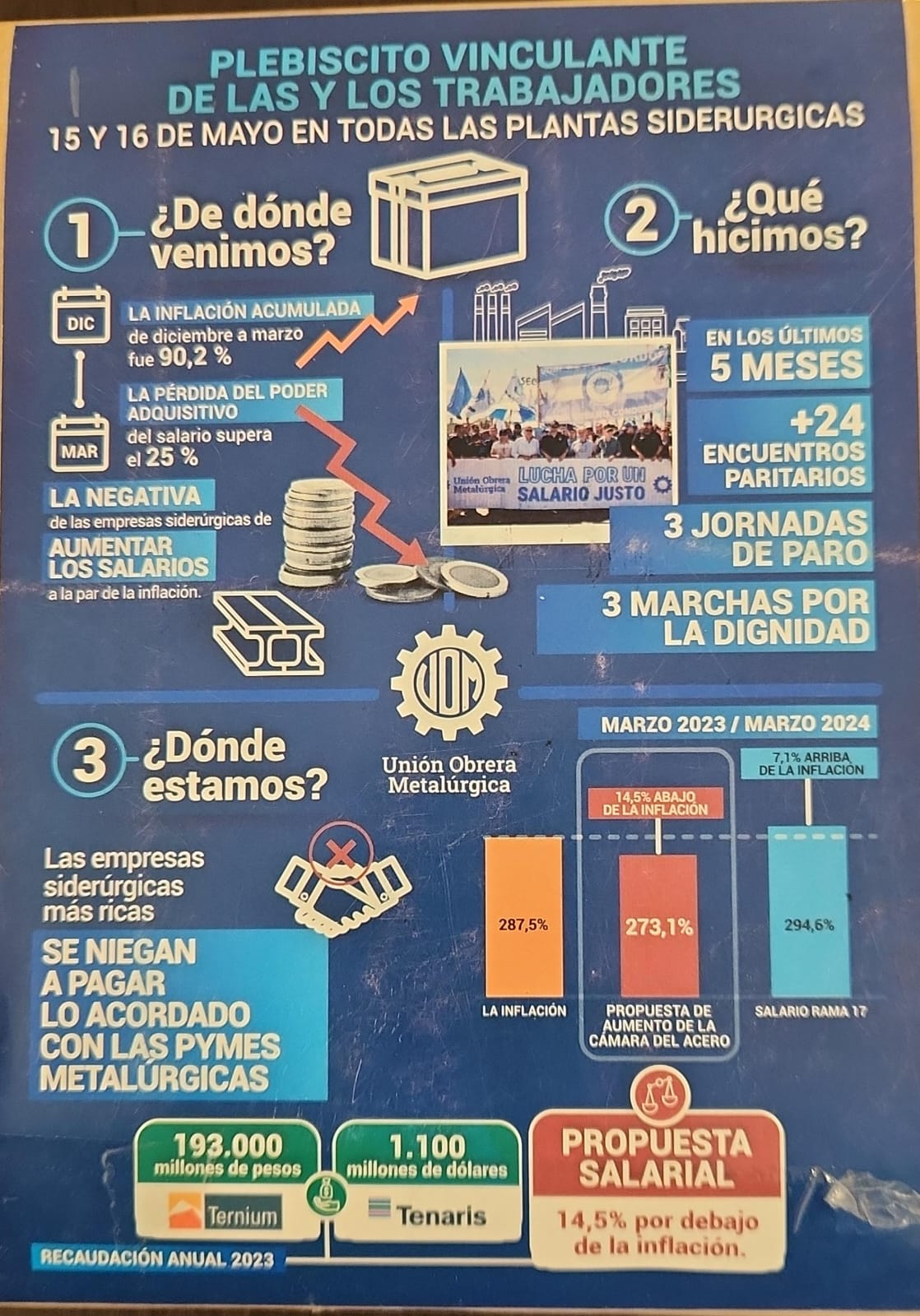 Dicho plebiscito se está llevando a cabo este miércoles 15 y jueves 16 de mayo, en las distintas plantas siderúrgicas. En nuestra región ésto incluye la Planta General Savio de Ternium, dos empresas de Comirsa y las plantas de Acindar. Allí, los trabajadores están votando por SI o por NO a la propuesta empresarial.