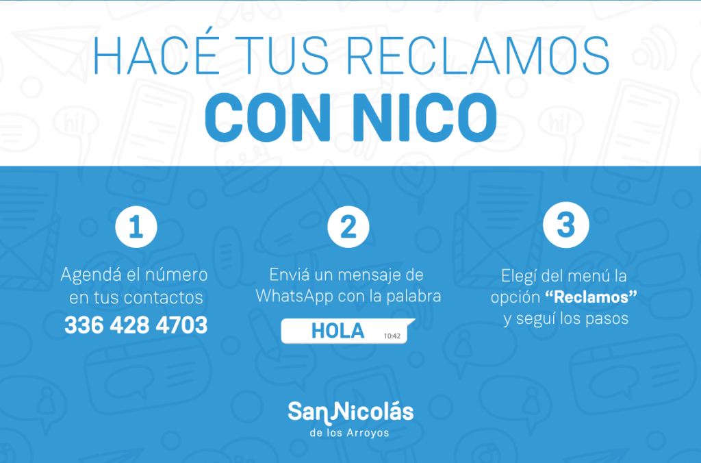 Con el asistente virtual Nico, los trámites municipales se pueden realizar de manera más ágil y rápida a través de WhatsApp. Para ello, deben agendar en su teléfono el 3364284703 y enviar un mensaje con la palabra “Hola”. A partir de allí, Nico brindará las diferentes opciones para que el trámite pueda realizarse.