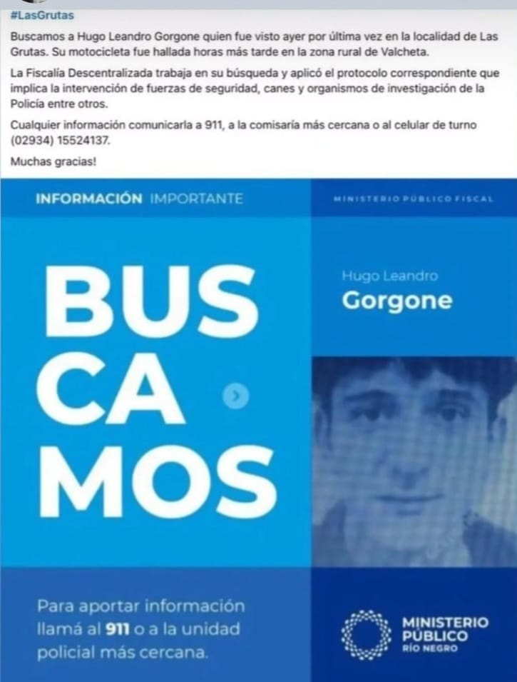 Las actuaciones judiciales se tramitan en la Unidad Policial 29° por «presunta desaparición de persona», en la búsqueda y/o ubicación del ciudadano Hugo Leandro Gorgone, de San Nicolás y con domicilio en Las Grutas.