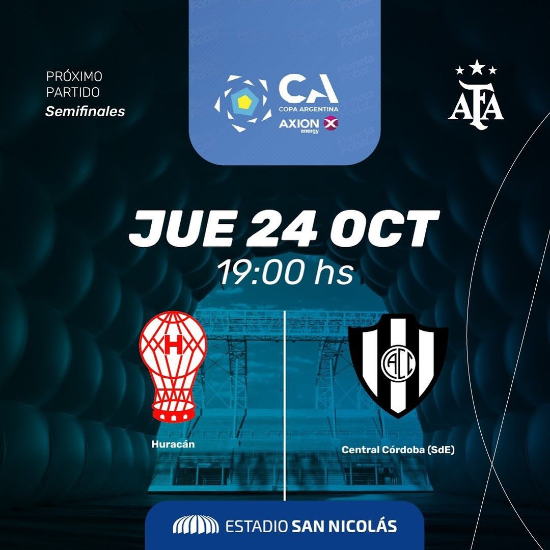 Este jueves 24 de octubre de 10:00 a 18:00 estará habilitada la venta de entradas exclusiva para nicoleños para la primera semifinal de la Copa Argentina entre Huracán y Central Córdoba de Santiago del Estero que se disputará este jueves a las 19 hs. en el Estadio San Nicolás.