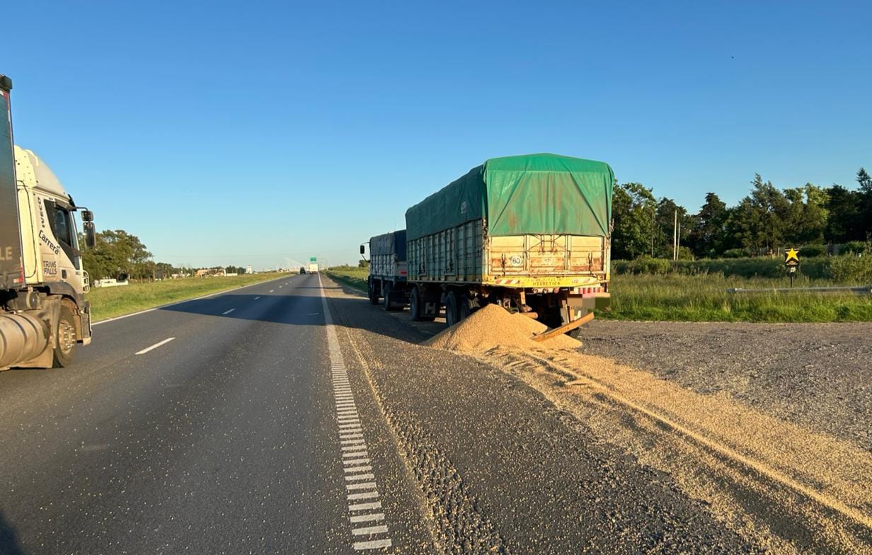 El conductor del camión, un hombre de 57 años, resultó ileso, aunque el impacto causó daños en la parte trasera izquierda del acoplado, provocando el derrame parcial de la carga de soja sobre la banquina.