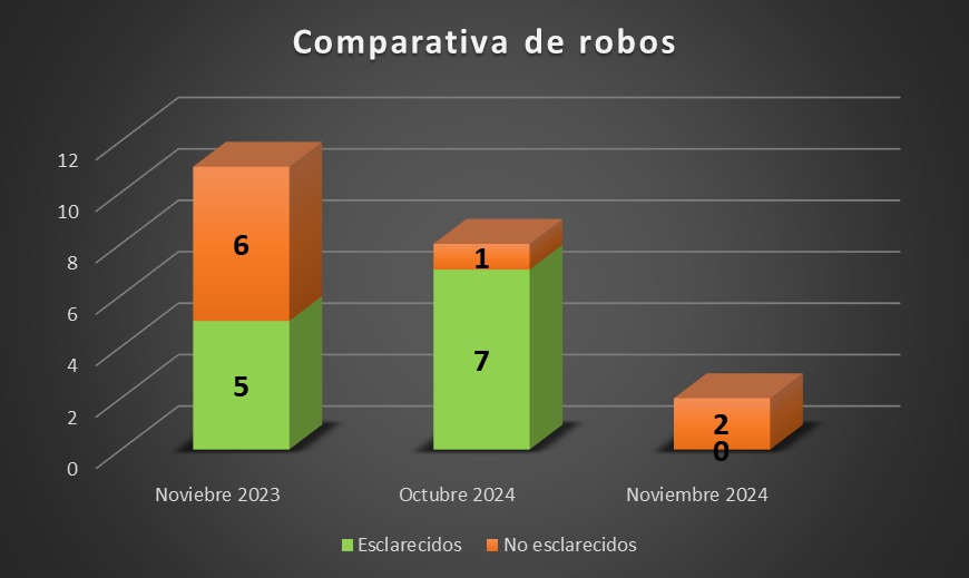 En otro de los cuadros de resumen se describe que de los delitos robos y hurtos sucedidos durante el primer año de gestión, se observa una disminución muy marcada de los mismos, en casi todas las comparativas interanuales, remarcando noviembre de 2024 como el mes en el que menos delitos han sucedido desde el diseño y la implementación del plan integral de seguridad del actual intendente Mauro Poletti.
