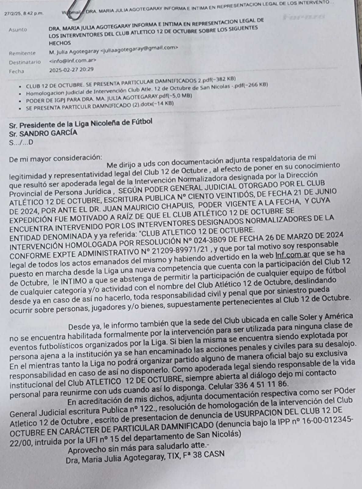 Lo cierto es que ni bien fue designada, la Dra. Agotegaray envió una carta (publicada abajo) al Presidente de la Liga Nicoleña de Fútbol, Sandro García, imponiendolo de la situación. Si bien en un principio la decisión era que 12 de Octubre deje de competir en sus distintas categorías deportivas, esa medida logró revertirse por parte de las autoridades locales de la Liga. Ahora el histórico club puede seguir compitiendo, pero todos los ingresos y egresos de la institución son administrados por la Dra. Agotegaray. A su vez, el Presidente de 12 de Octubre, Marcelo Acuña, fue designado como Coordinador de las actividades deportivas de dicha institución.