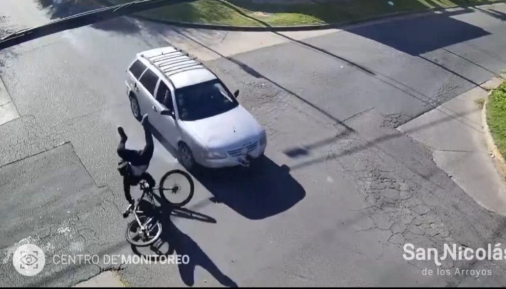 Se puede observar a través de las Cámaras de Monitoreo Municipal el momento en que el vehículo conducido por un hombre de 44 años se encuentra en la esquina, con la bicicleta guiada por un menor de 14 años y terminan colisionando.