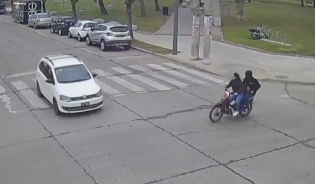 Se puede observar a través de las Cámaras de Monitoreo Municipal el momento en que el auto conducido por un hombre de 34 años, acompañado por sus dos hijos menores y su pareja de 32 años, intentan cruzar la intersección y una motocicleta guiada por una mujer de 24 años, impacta contra el vehículo.