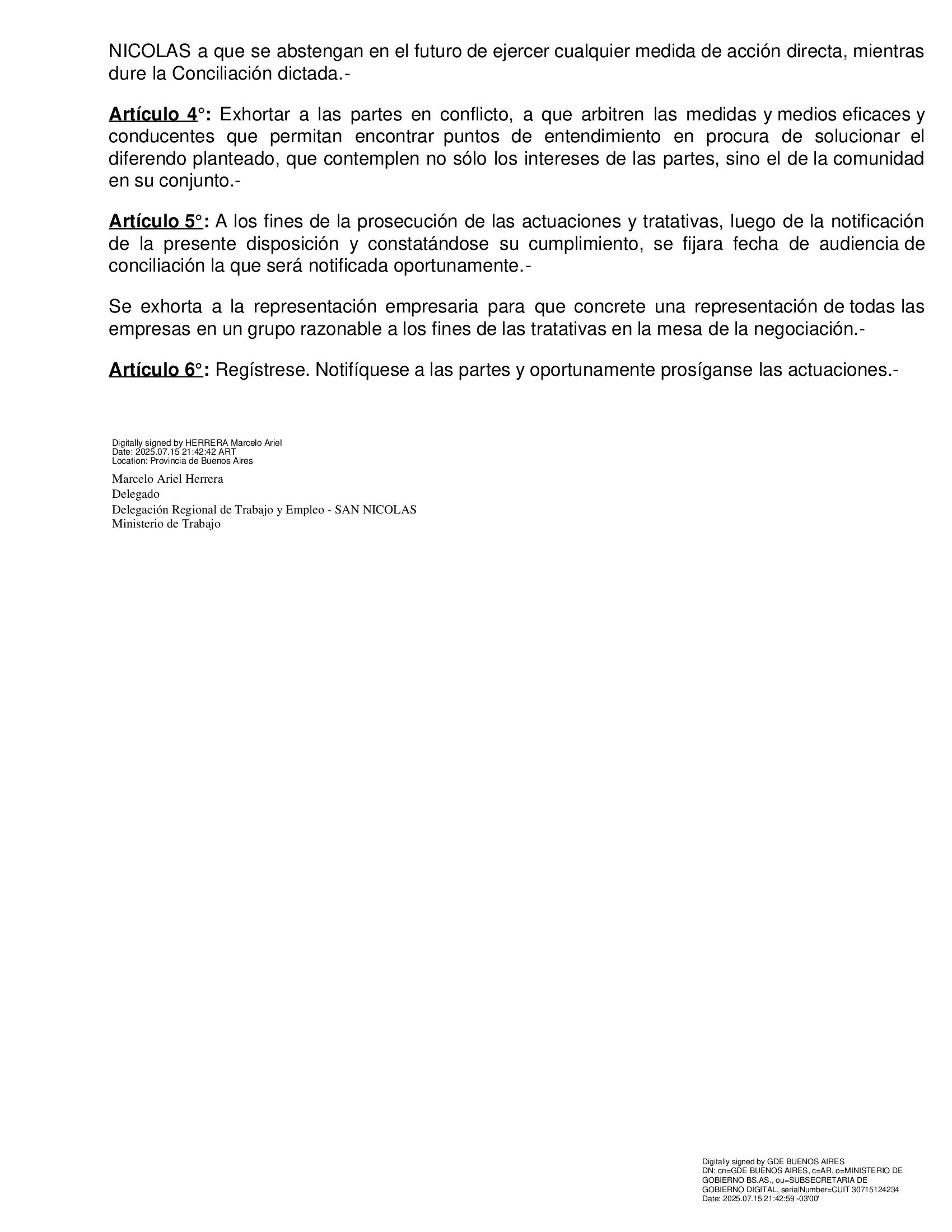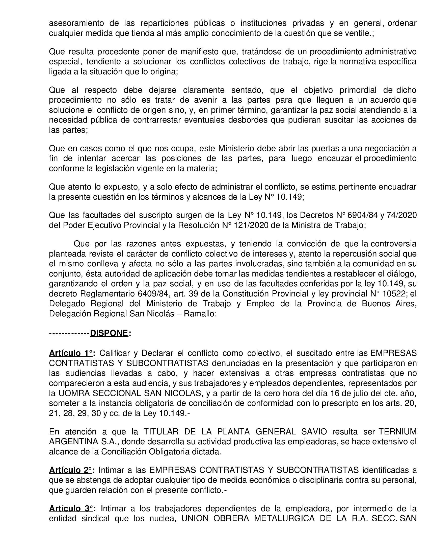 A continuación publicamos la resolución tomada este martes por la Delegación San Nicolás-Ramallo del Ministerio de Trabajo bonaerense: