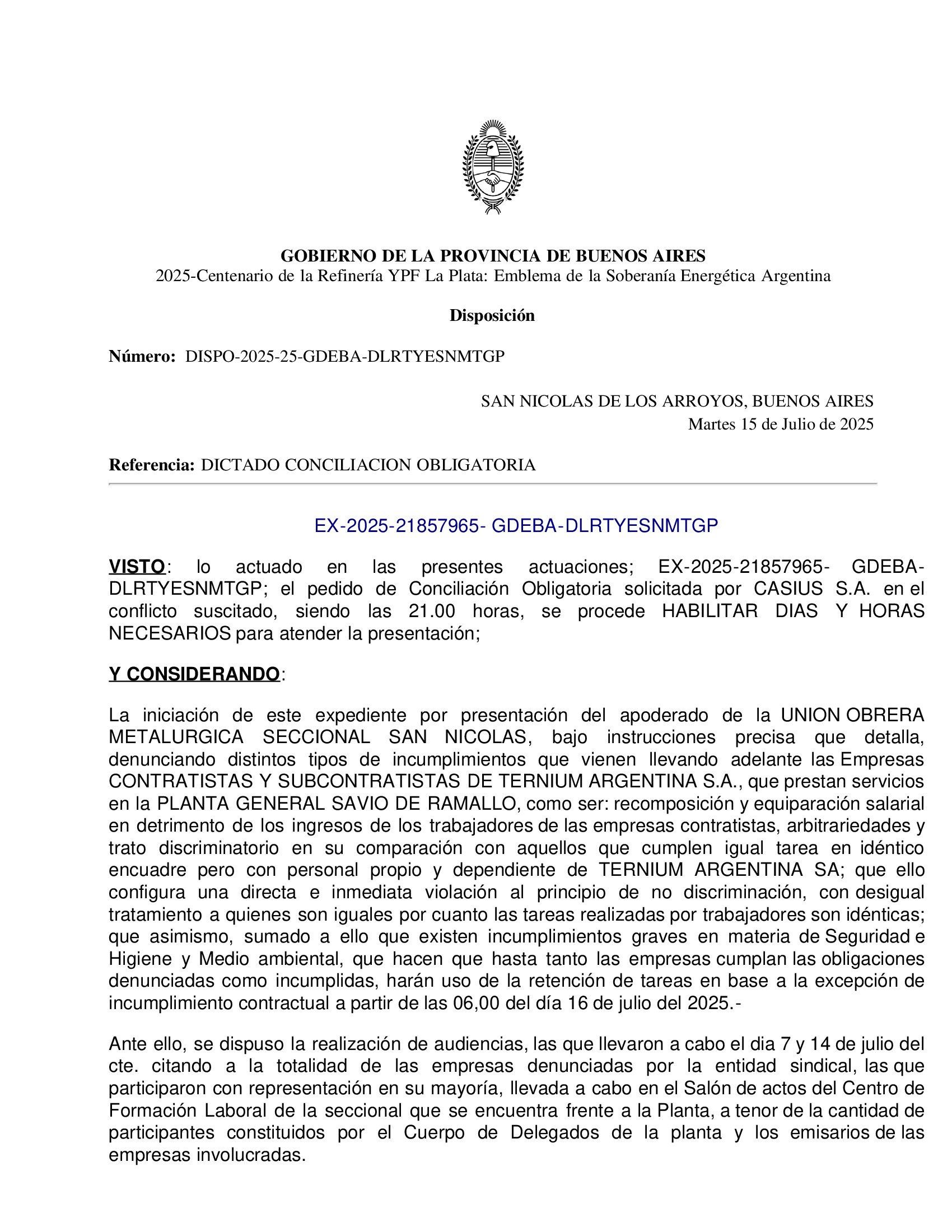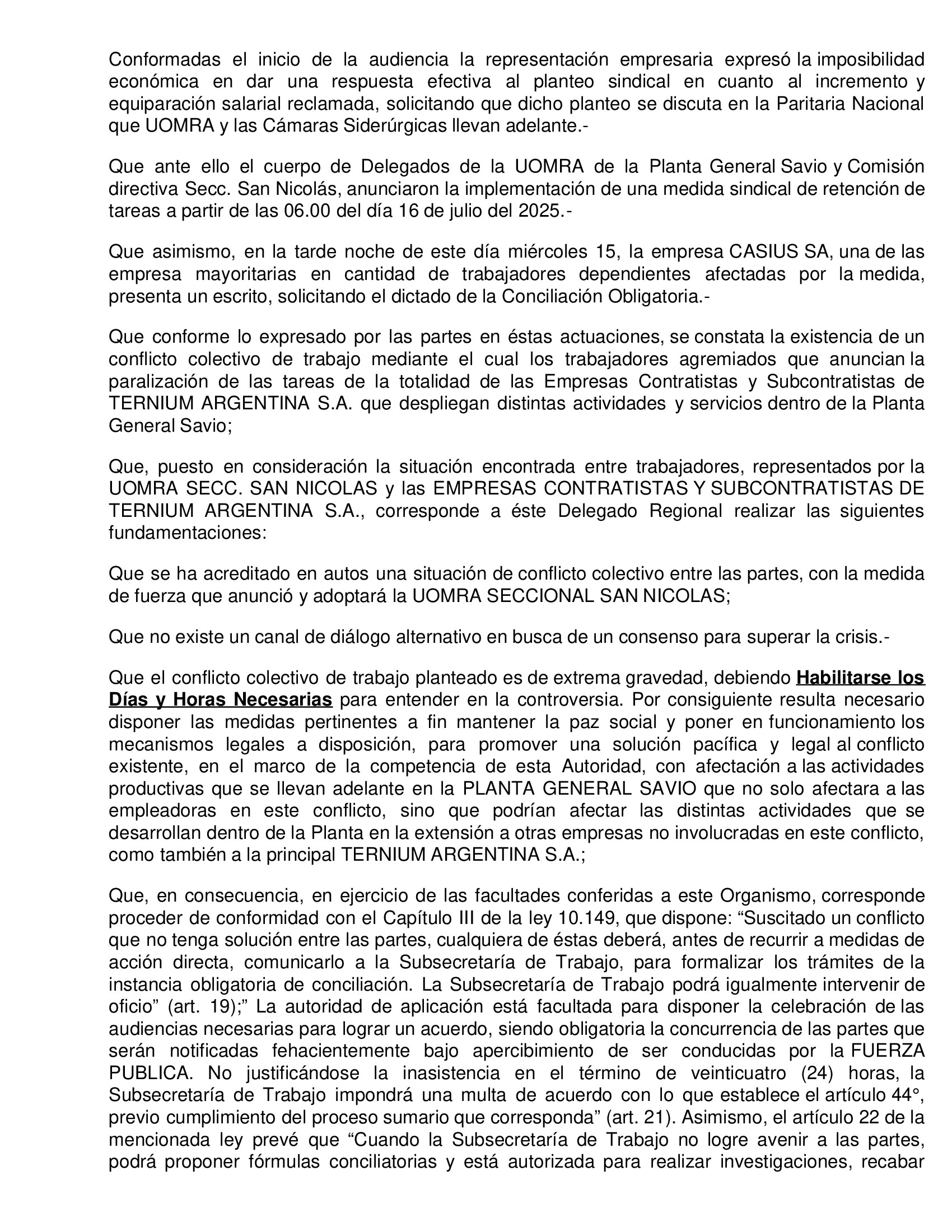 La Delegación San Nicolás del Ministerio de Trabajo de la provincia de Buenos Aires, dictó este martes la conciliación obligatoria, por lo que momentáneamente ha quedado sin efecto el paro de los trabajadores metalúrgicos nucleados en UOM, que iba  a paralizar este miércoles sus actividades en la Planta General Savio de Ternium, en el Partido de Ramallo.