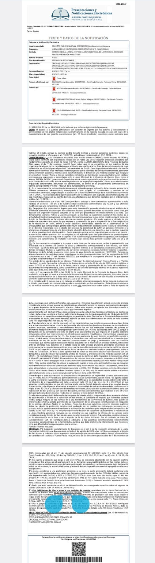En tiempo extra, Fuerza Patria logró este sábado revertir la negativa de la Junta Electoral de la provincia de Buenos Aires y, finalmente, la lista de candidatos a concejal que encabeza en San Nicolás la camporista Cecilia Comerio (que había sido presentado fuera del plazo temporal establecido) deberá tener el visto bueno para poder integrar la oferta electoral en las legislativas bonaerenses del próximo 7 de septiembre. La situación límite fue revertida a través de un recurso de amparo que los apoderados de FP habían presentado en la Justicia.