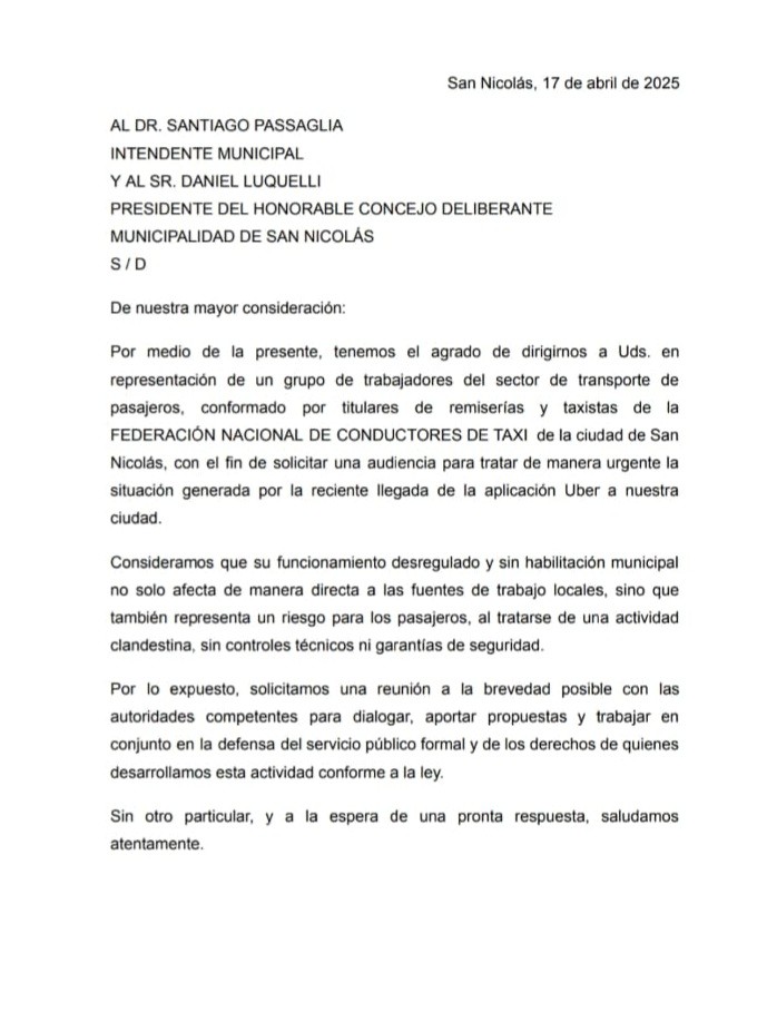 Más abajo publicamos además el pedido de audiencia que le hicieron por escrito al Intendente Santiago Passaglia: