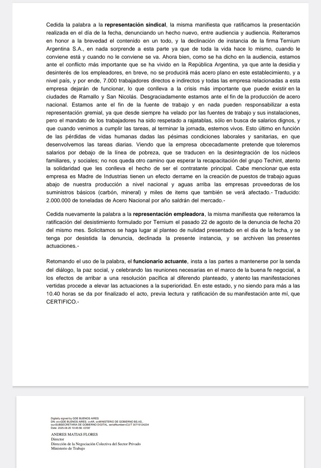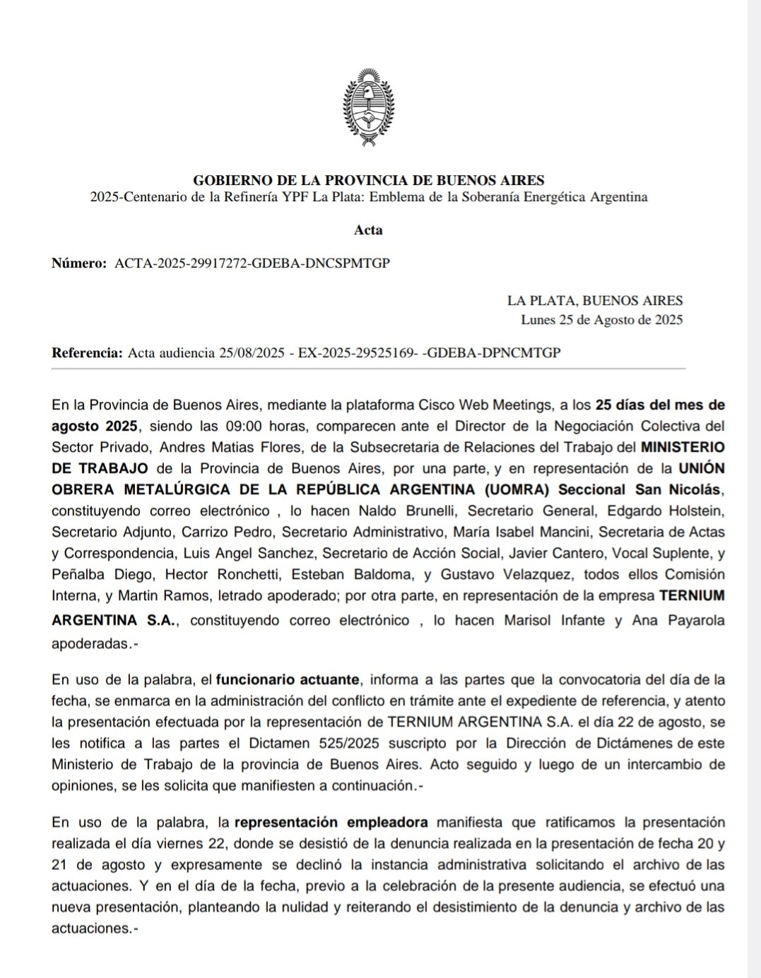 Por su parte, la Unión Obrera Metalúrgica difundió el acta realizada en sede del Ministerio de Trabajo de la provincia de Buenos Aires, donde consta la posición de ambas partes, y donde el gremio plantea que se está ante el conflicto más grande de la historia argentina. A continuación publicamos dicha acta: