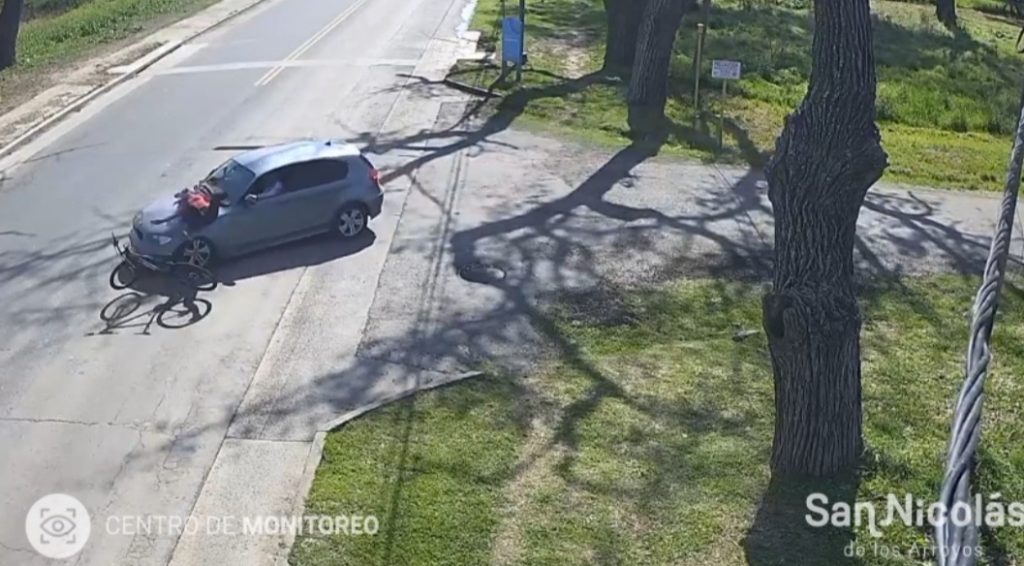Se puede observar a través de las Cámaras de Monitoreo Municipal el momento en el cuál el auto, conducido por un hombre de 63 años intenta doblar hacia la avenida y termina colisionando contra la bicicleta, guiada por una mujer de 57 años.