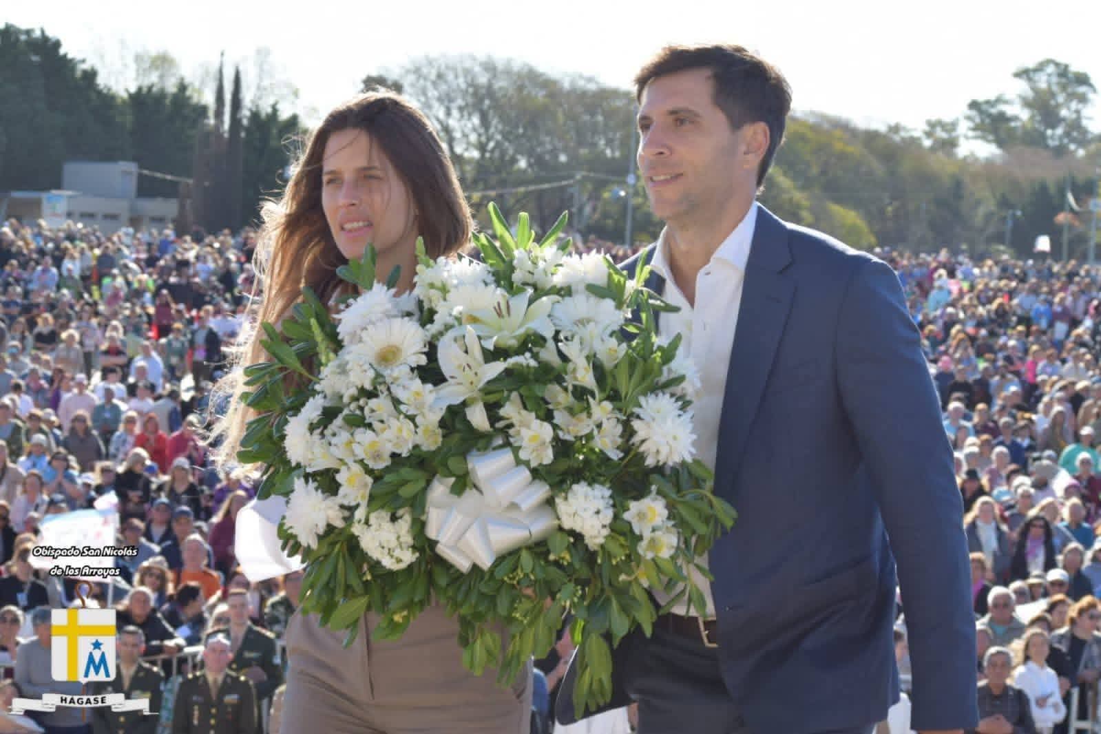 El jefe comunal, junto a su pareja, ofreció una ofrenda floral a la imagen como señal de respeto y veneración. En ese mismo sentido, la celebración incluyó la entonación del Himno Nacional Argentino, signo de encuentro y comunión para toda la asamblea.