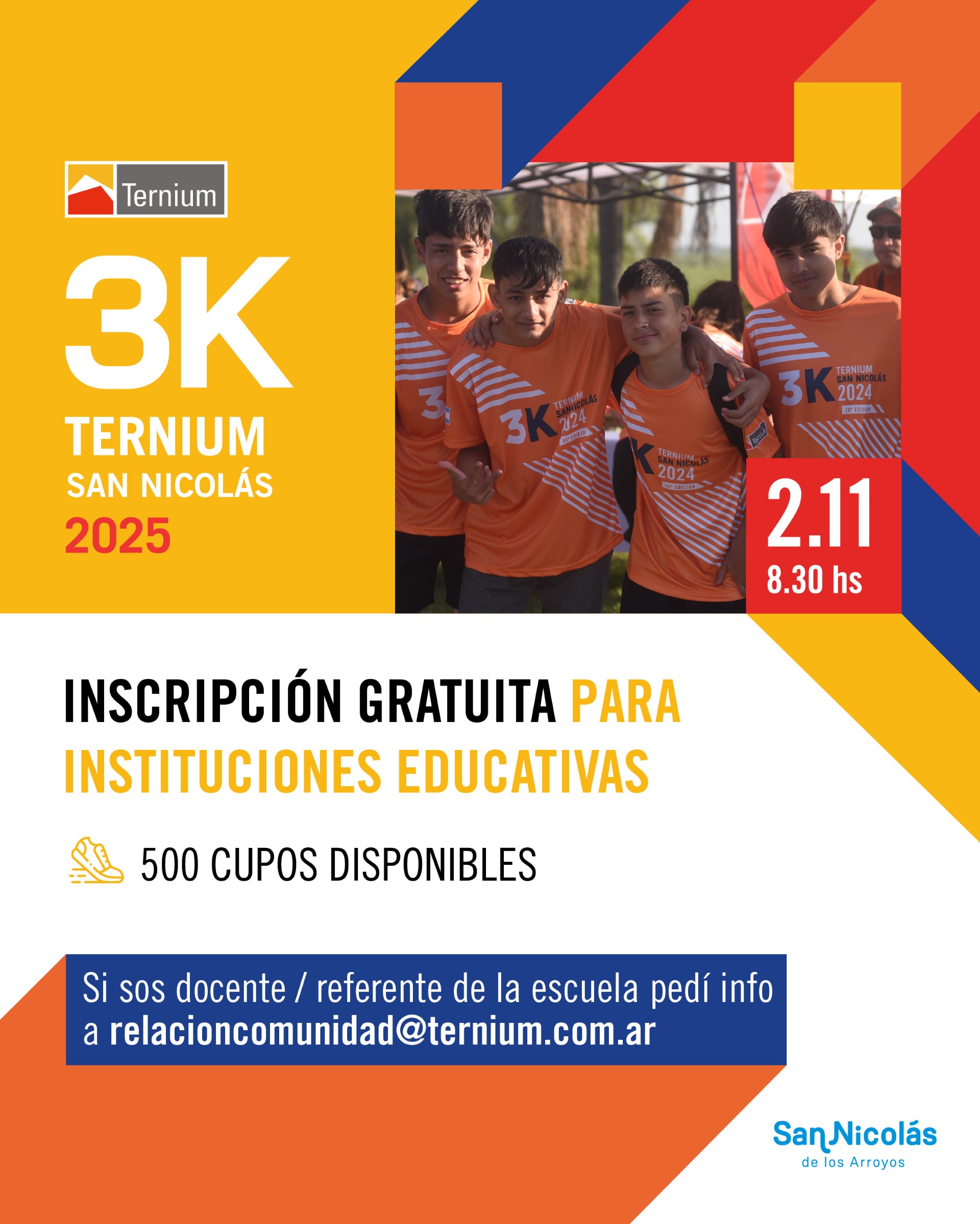 También se invita a participar de manera gratuita a las instituciones educativas y ONGS de San Nicolás y Ramallo, quienes además de disfrutar de una actividad grupal saludable y al aire libre; participaran de sorteos con premios para la institución que representan. Para inscribirse, el referente de la institución debe solicitar la planilla de deslinde de responsabilidades y la planilla de resumen de inscriptos y más información al mail relacioncomunidad@ternium.com.ar
