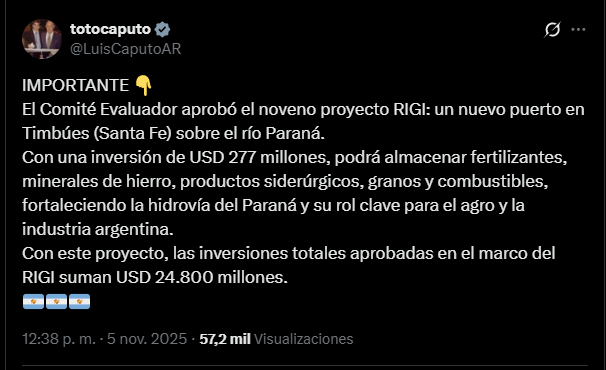 Luis caputo, ministro de Economía, lo anunció en la red social X: “El Comité Evaluador aprobó el noveno proyecto RIGI: un nuevo puerto en Timbúes (Santa Fe) sobre el río Paraná”, comenzó. Luego, agregó: “Con una inversión de USD 277 millones, podrá almacenar fertilizantes, minerales de hierro, productos siderúrgicos, granos y combustibles, fortaleciendo la hidrovía del Paraná y su rol clave para el agro y la industria argentina”. Por último, concluyó: “Con este proyecto, las inversiones totales aprobadas en el marco del RIGI suman USD 24.800 millones”.