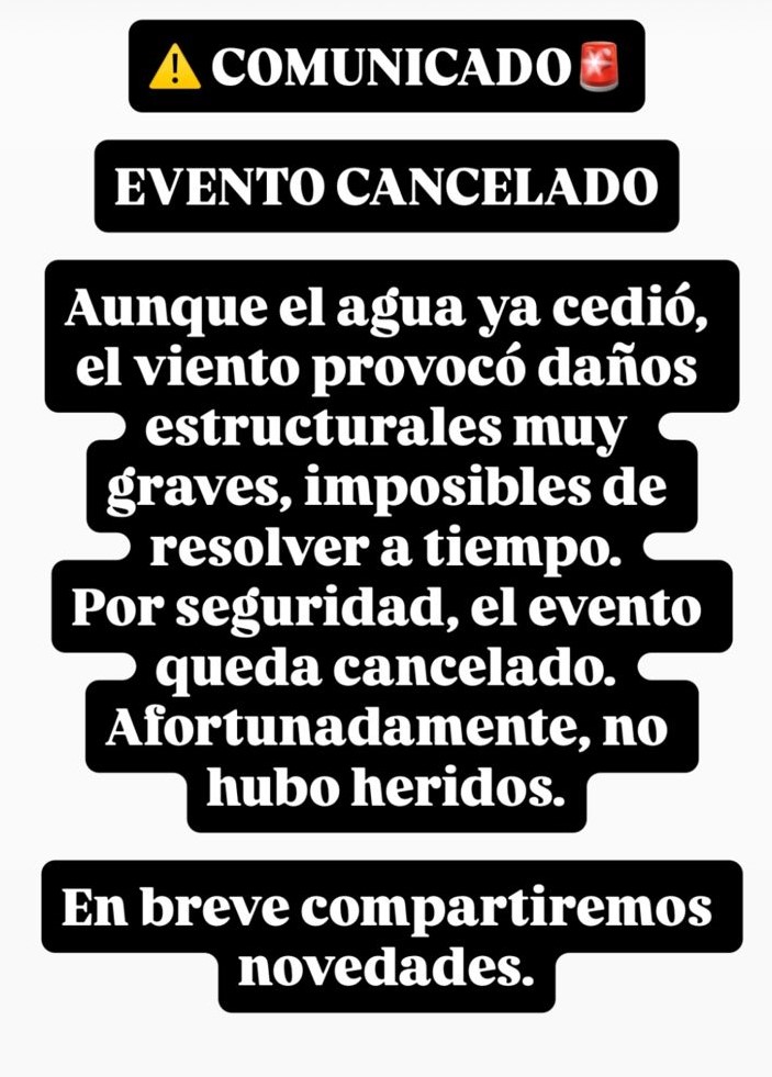El primer comunicado, bajo el título EVENTO CANCELADO, señala textualmente: «Aunque el agua ya cedió, el viento provocó daños estructurales muy graves, imposibles de resolver a tiempo. Por seguridad, el evento queda cancelado. Afortunadamente no hubo heridos. En breve compartiremos novedades»