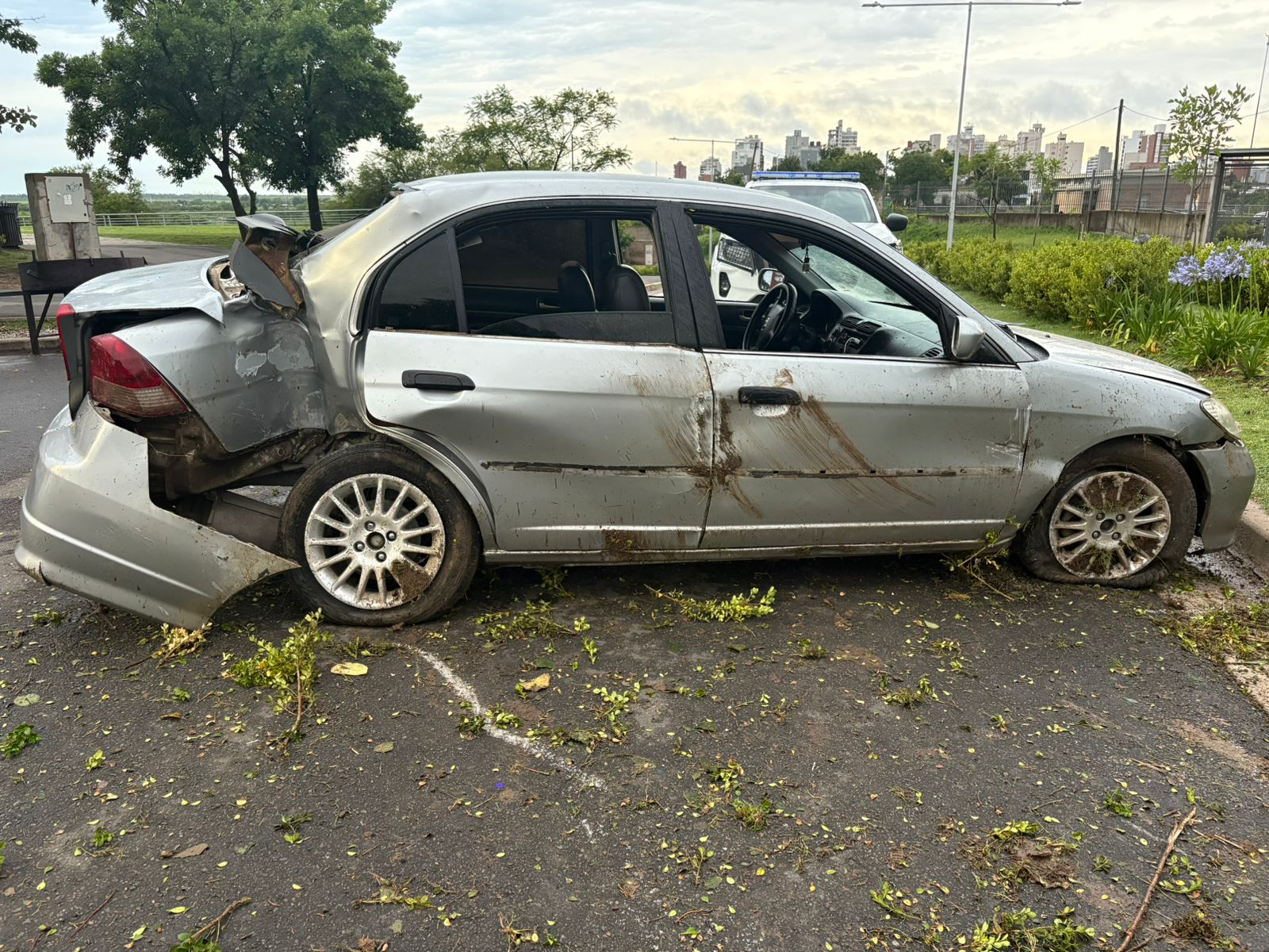 El conductor explicó que mientras circulaba por Díaz Bancalari en sentido Norte-Sur pisó con los neumáticos una rama grande que se encontraba sobre la cinta asfáltica, producto del temporal. Tras el impacto con la rama, el joven perdió el control del rodado, impactando primeramente con el cordón para luego subirse encima del cantero central, donde finalmente chocó contra un poste de alumbrado público.