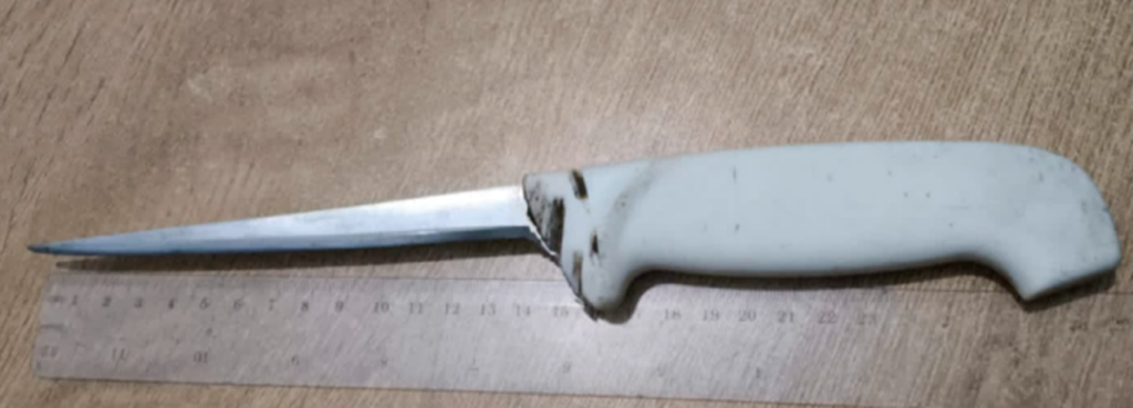 En continuidad con sus actuaciones, los efectivos que intervinieron en el conflicto secuestraron el arma blanca utilizada por el atacante. La misma fue descripta como un cuchillo de carnicero, con una longitud de aproximadamente 29 centímetros.
