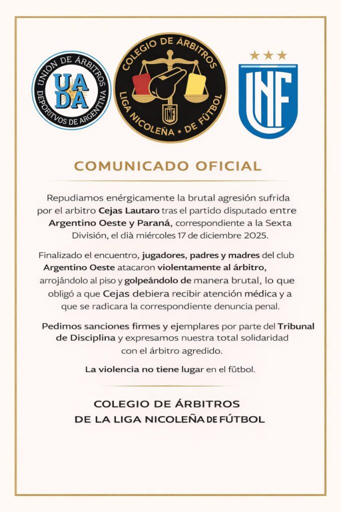Este miércoles al finalizar la jornada de inferiores entre Argentino Oeste- Paraná, ambos equipos lo hicieron en cancha de 12 de Octubre y por la Copa de Plata, fue agredido el árbitro Lautaro Cejas por los hinchas de Argentino Oeste en el momento que los árbitros dejaban el estadio.
