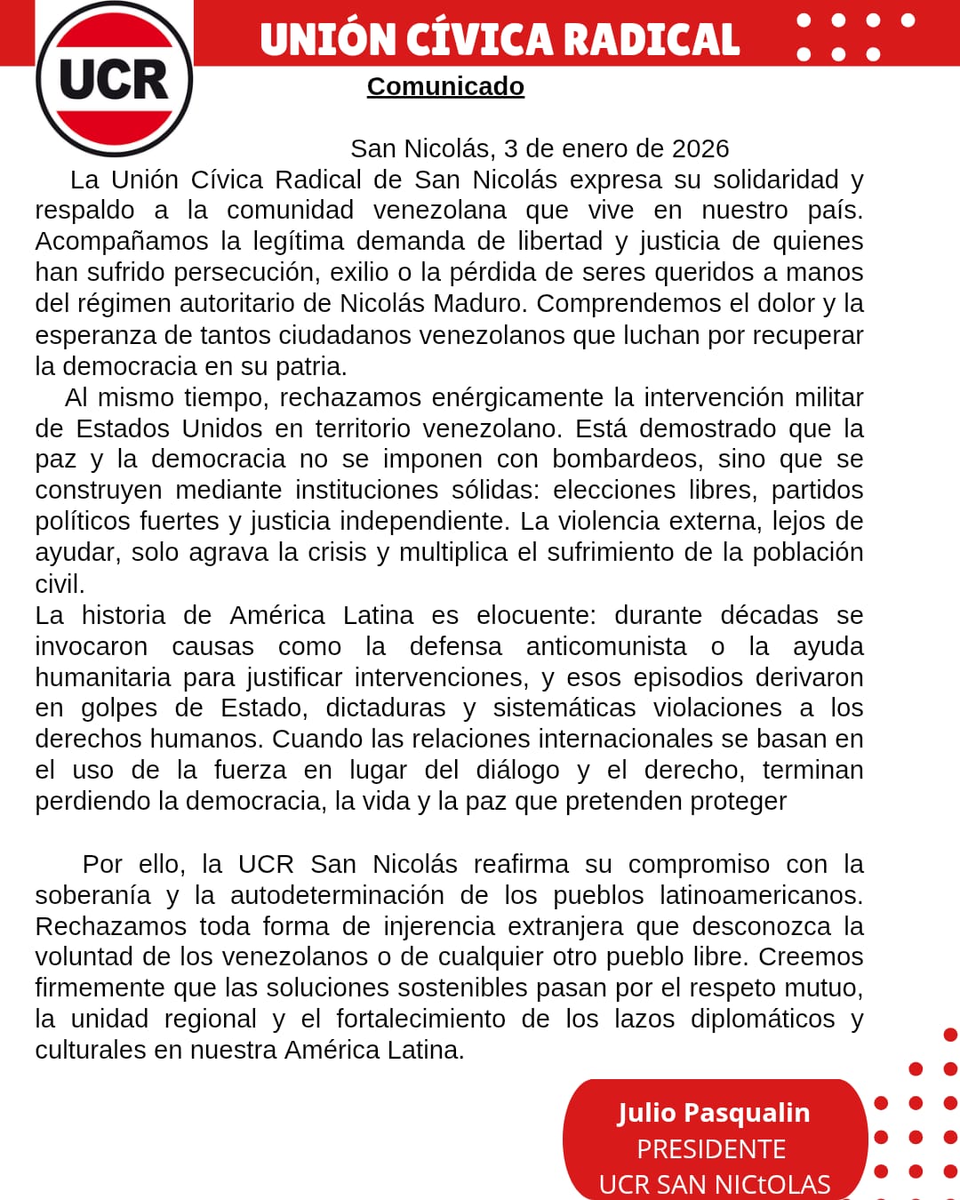 El Comité de distrito de la Unión Cívica Radical de San Nicolas, emitió un comunicado de prensa en el que expresa su respaldo a la lucha del pueblo venezolano en pos de su libertad, pero al mismo tiempo expresa su rechazo a la intervención militar estadounidense en aquel país.