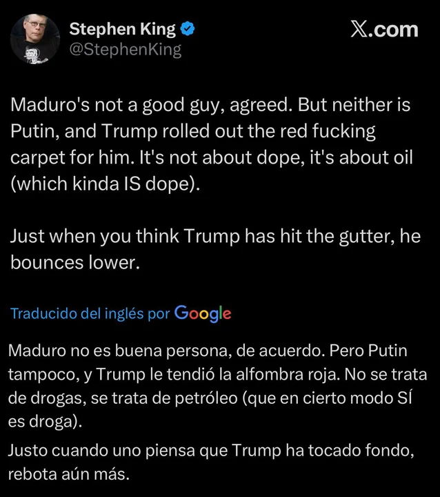 A través de un posteo contundente, el autor de It y El resplandor dejó en claro que su mirada iba más allá de la figura del líder venezolano: “Maduro no es buena persona, de acuerdo. Pero Putin tampoco y Trump le tendió la alfombra roja”, escribió King.