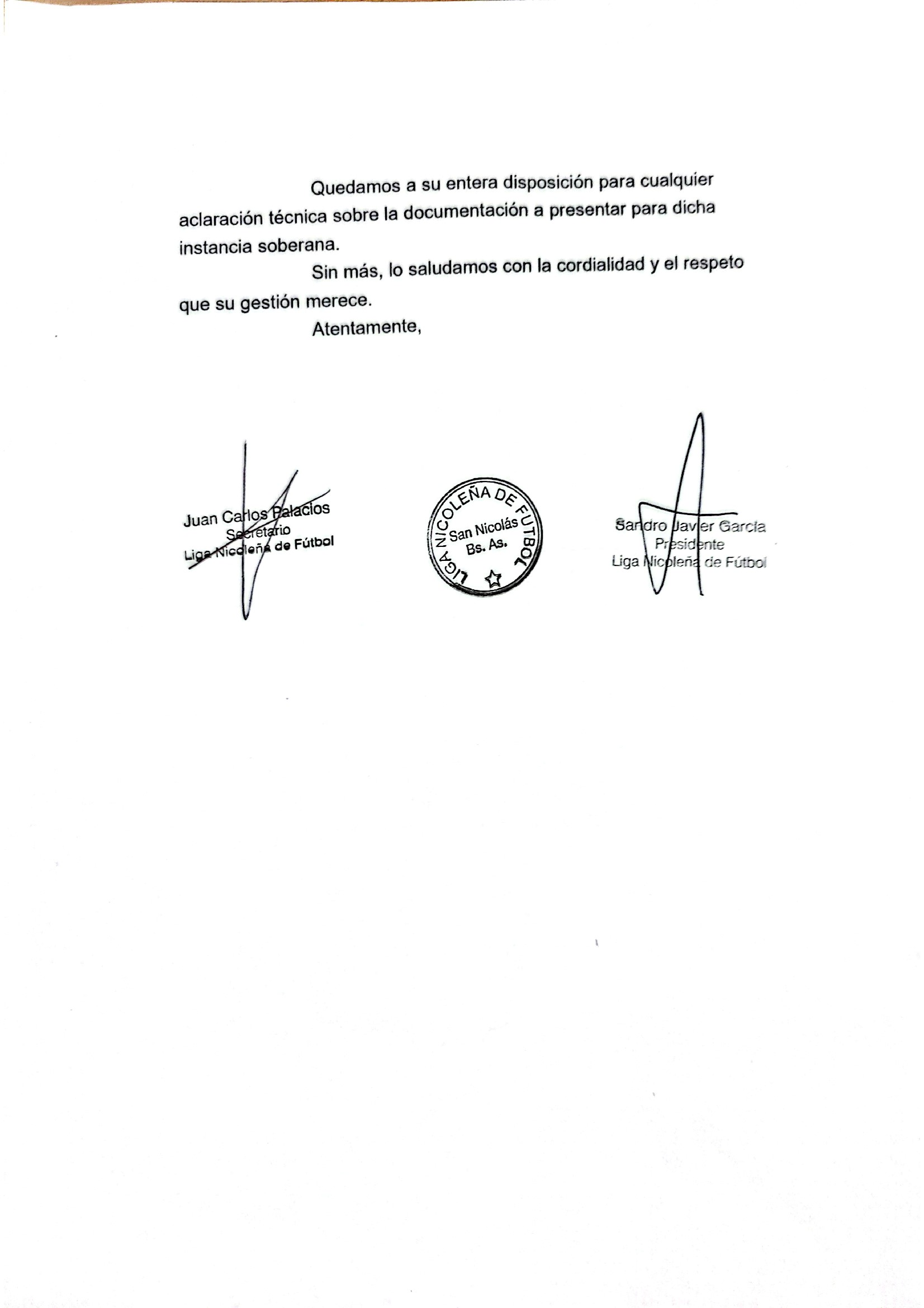 La nota ya fue enviada a las autoridades de Sánchez FC, encabezadas por su Presidente Juan Mendiburu, y lleva las firmas de Sandro Javier García (Presidente de la Liga Nicoleña de Fútbol) y Juan Carlos Palacios (Secretario).