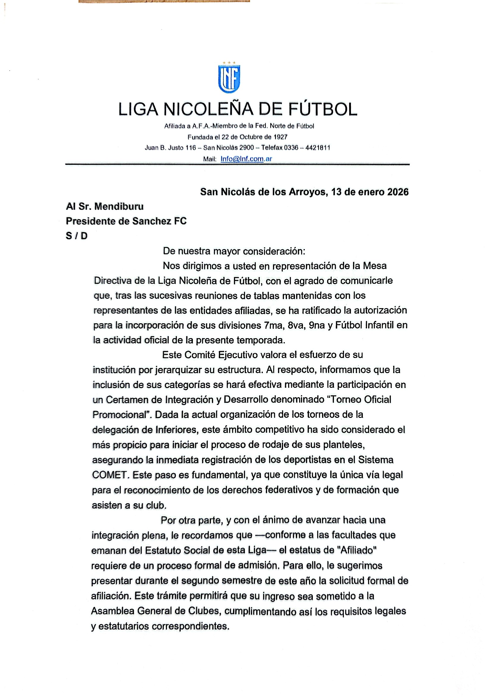 La Liga Nicoleña de Fútbol, autorizó finalmente a Sánchez Fútbol Club para que pueda participar en la presente temporada de un «Torneo Promocional Oficial» con sus divisiones inferiores séptima, octava y novena, como así también fútbol infantil.