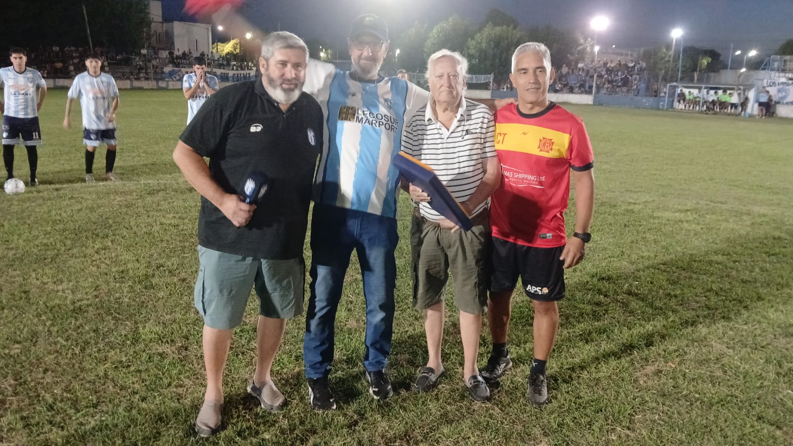 El nicoleño Piaggio, criado futbolísticamente en Conesa, recibió un justo homenaje de la Liga Nicoleña de Fútbol. Su Presidente, Sandro García, le entregó una plaqueta recordatoria antes de que Piaggio diera el puntapié inicial.