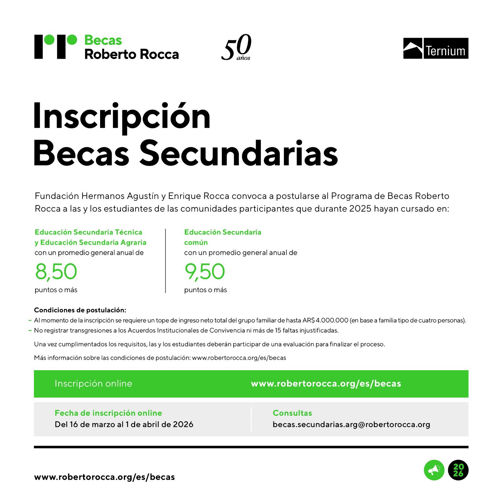 Ternium invita a estudiantes de nivel secundario de comunidades participantes a inscribirse en el Programa de Becas Roberto Rocca, una iniciativa de la Fundación Hermanos Agustín y Enrique Rocca que desde hace 50 años busca acompañar la trayectoria educativa de jóvenes con buen desempeño académico.