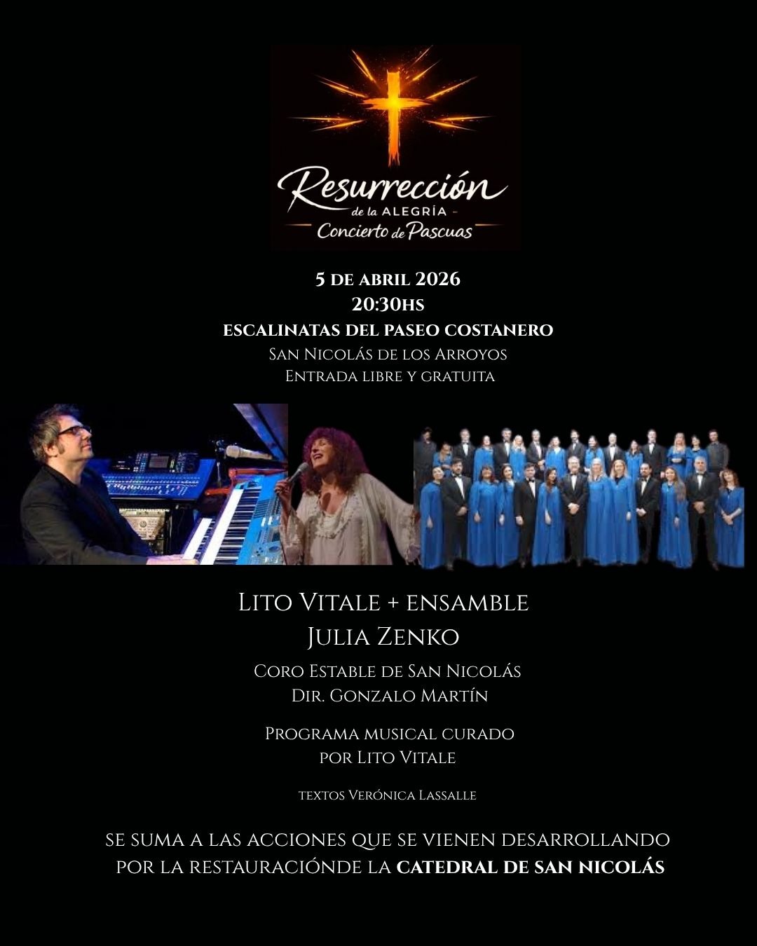 El próximo 5 de abril a las 20, las Escalinatas del Paseo Costanero de San Nicolás de los Arroyos serán el escenario de un evento cultural y espiritual de gran escala: el concierto “Resurrección de la Alegría”, una propuesta abierta y gratuita que reunirá a destacados artistas y convocará a toda la comunidad.